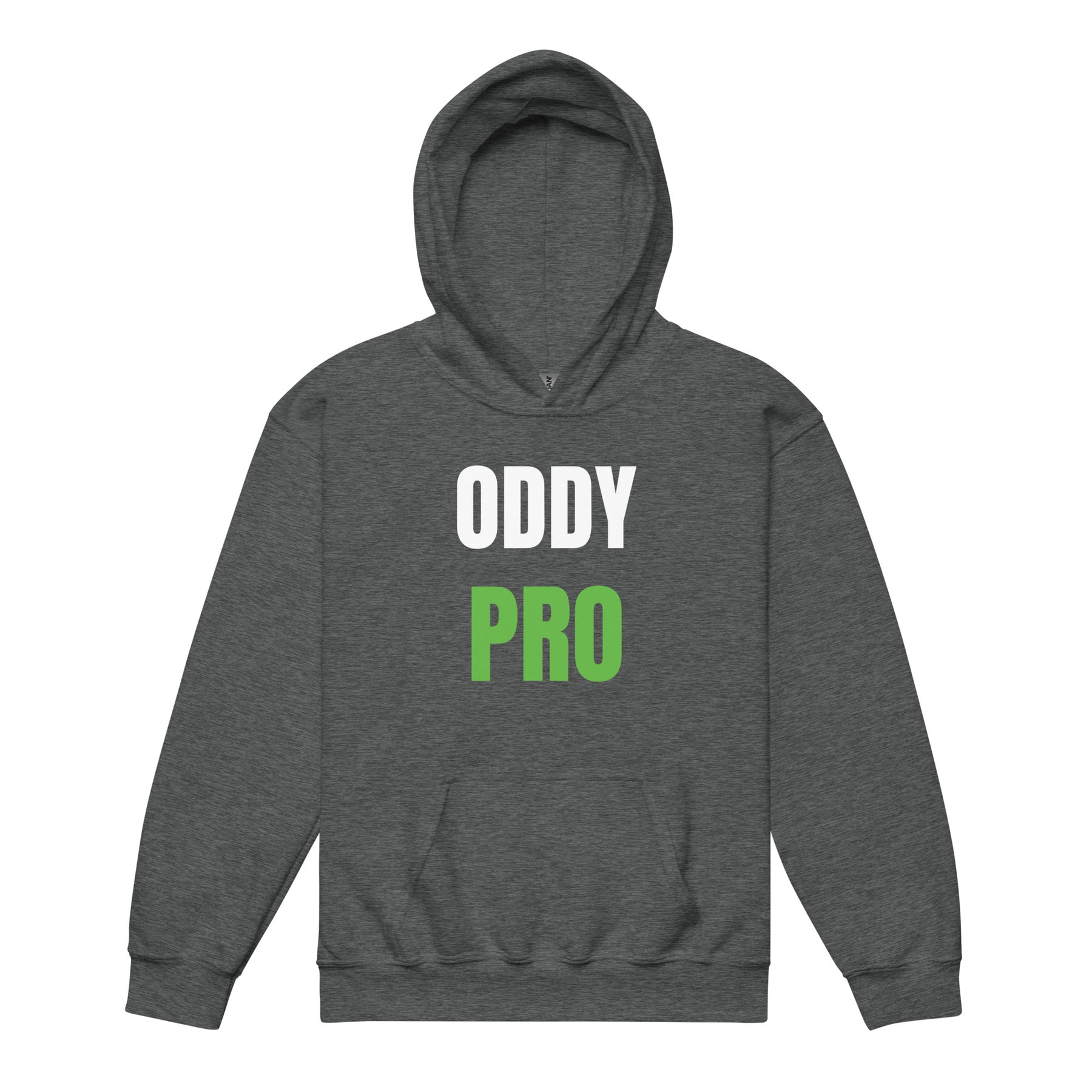 Oddy Pro Youth heavy blend hoodie in dark grey with bold white and green lettering, front view.