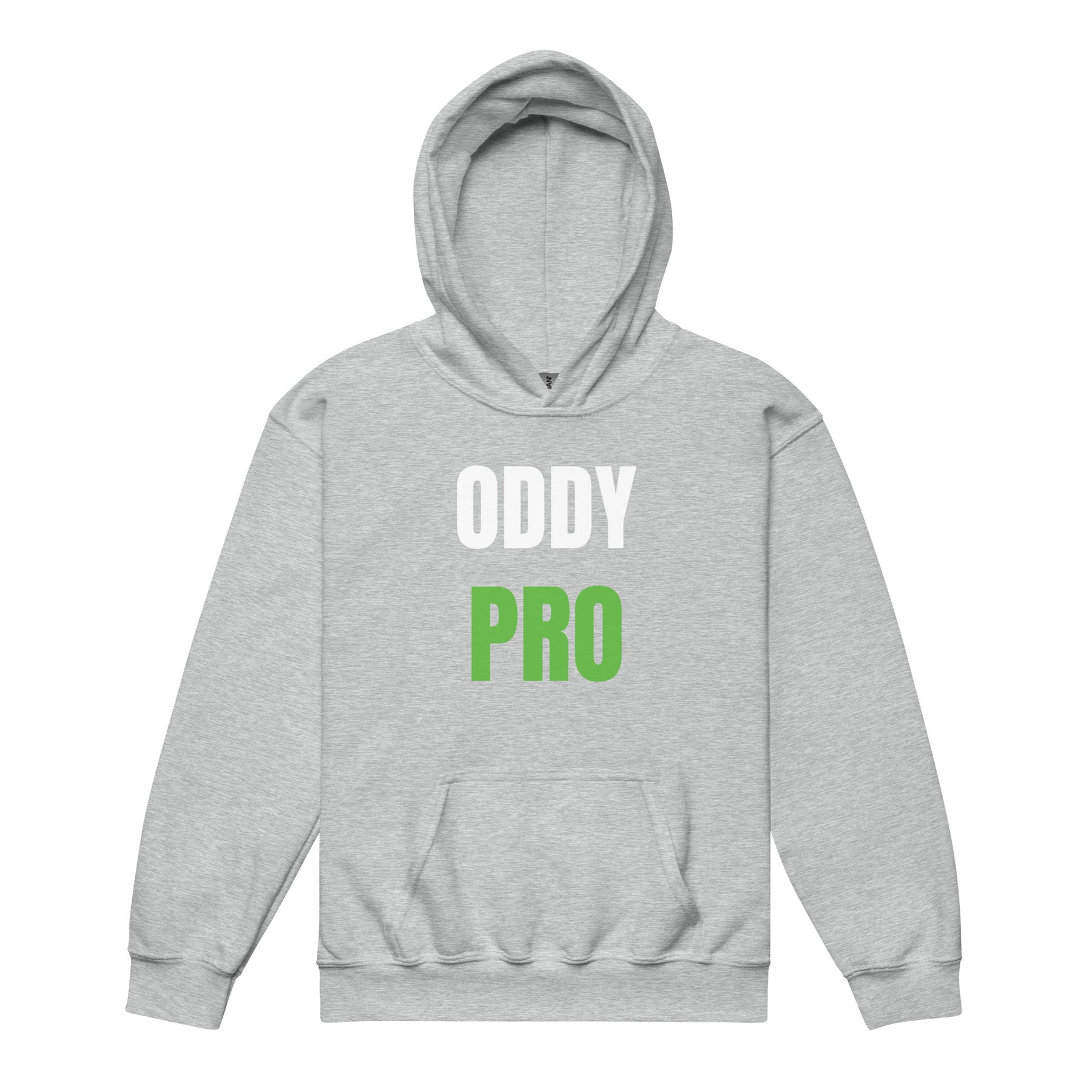 Oddy Pro Youth heavy blend hoodie in grey with white and green lettering, featuring a front pouch pocket.
